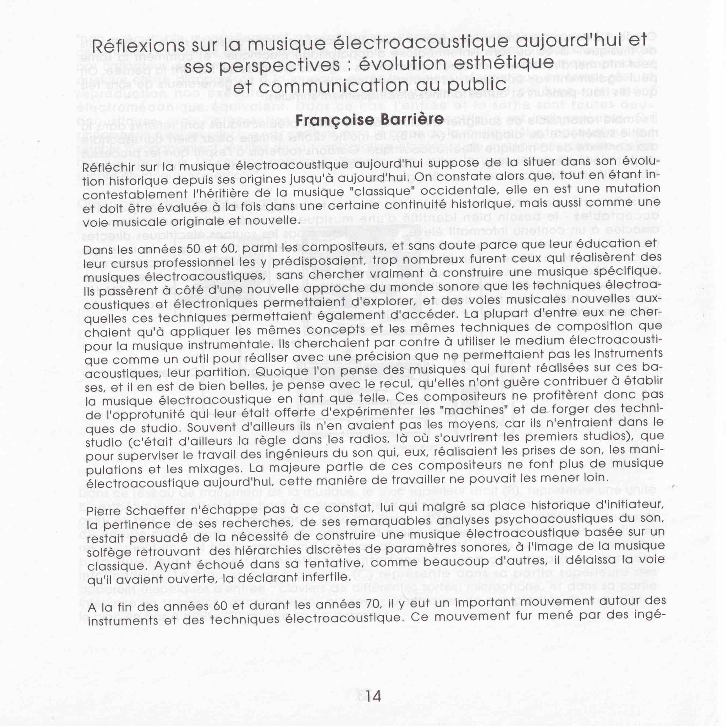 It is clear that although it is undoubtedly the heir of Western "classical" music, it is a mutation and must therefore be evaluated not only in the context of a certain historical continuity, but also as a unique and original musical approach. (Françoise Barrière)