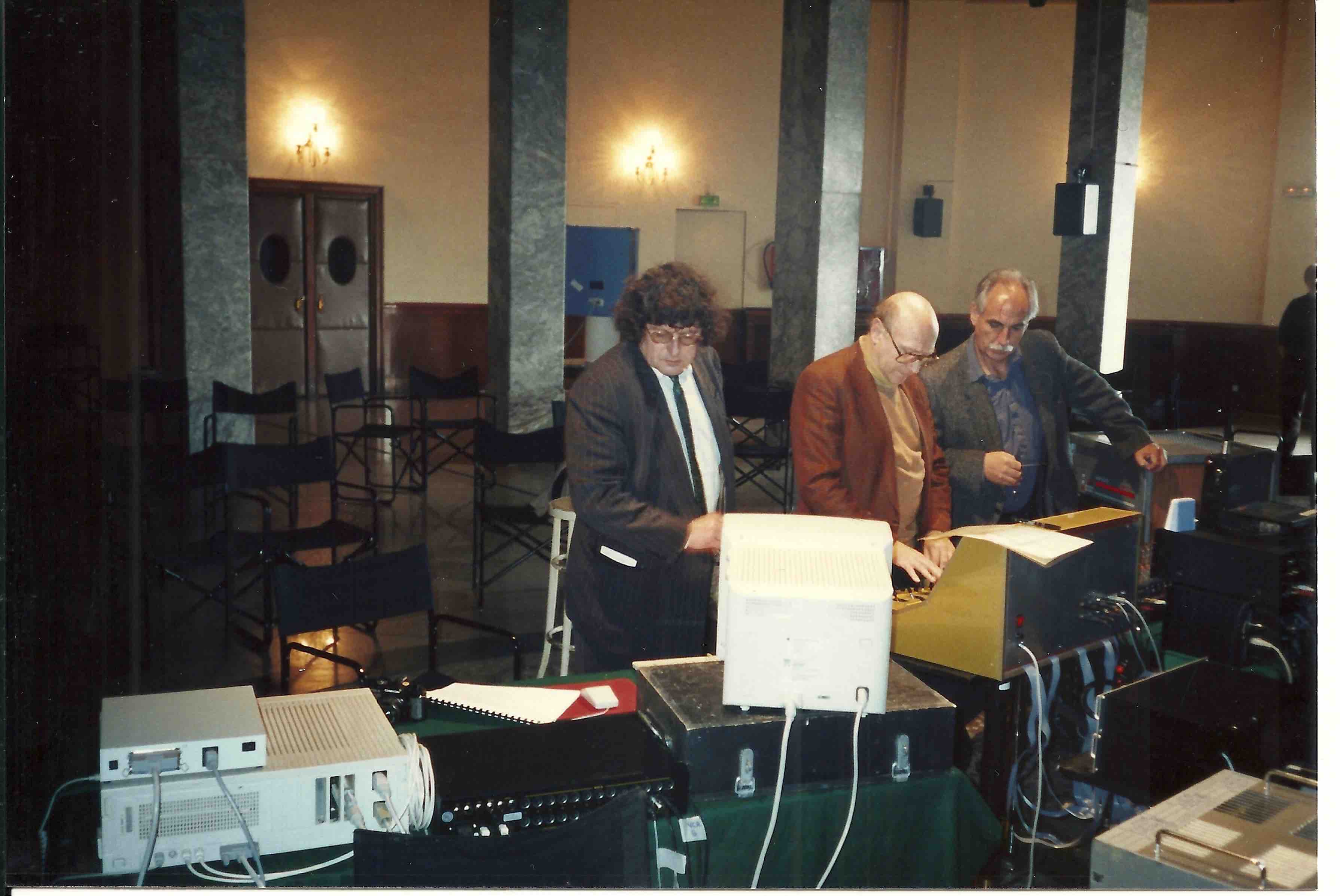 For sound control of the concerts, the Gmebaphone was brought from Bourges - "a processor/simulator of sonic electroacoustic space, as well as a polyphonic acoustic synthesizer of musical spaces". A seminar on its operation was also held; in the photograph, Christian Clozier, Pierre Boeswillwald, and Gabriel Brnčić appear preparing the device, and among those attending are Julio Sanz, Juan Antonio Lleó, Arturo Rodríguez Morató, Alfonso García de la Torre, Josep Sanz, and Françoise Barrière, seen in the foreground.
