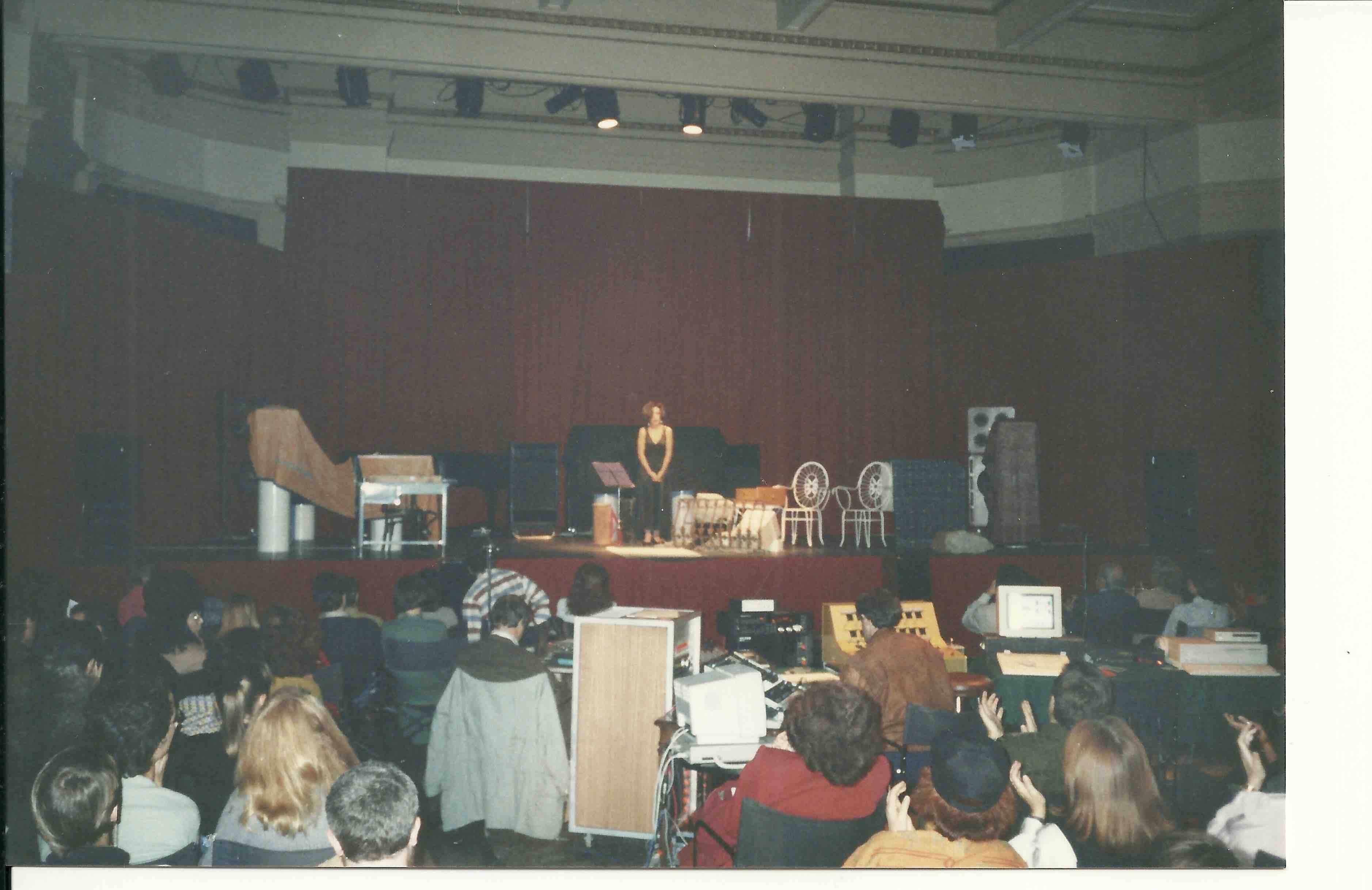 By 1995, electroacoustic music had become akin to = akin to = etc. This analogical extension allowed it to gain ground in other fields. Until then, it had been defined by its content (sound) while the concert as its primary container prevailed in a way that needed to be surpassed at that time. The 4th edition (1995) of the Punto de Encuentro festival included not only several concerts but also various sound installations. Aside from the individual works of Eduardo Polonio and José Iges + Concha Jerez, there was a noteworthy collective installation involving a Yamaha Disklavier piano connected to a Macintosh computer. In the following edition the number and variety of these kinds of proposals increased. Internet terminals were made available from which attendees could access electroacoustic music files located on servers around the world. The audience could also create MIDI files to be played through a set of sound reproduction devices. Similarly, a collective installation was set up for the continuous listening of computer-controlled music.